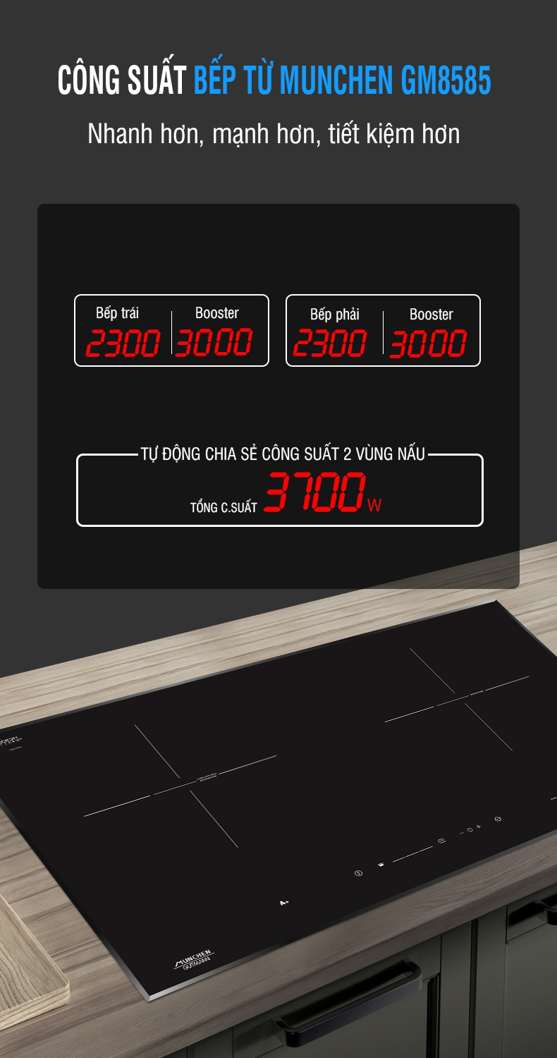Bếp từ Munchen GM8585 sở hữu 2 vùng nấu từ có thể sản sinh mức công suất max mỗi vùng là 3000w ở mức booster và 2300w ở mức ông suất cao nhất, nhưng khi sử dụng đồng thời cả 2 vùng nấu thì tổng công suất của bếp chỉ đạt được là 3700w do công nghệ tự động chia sẻ công suất IC5. Bên cạnh đó bếp từ Munchen GM8585 cũng được tích hợp các tính năng nấu thông minh như booster, Auto 37 min, ...